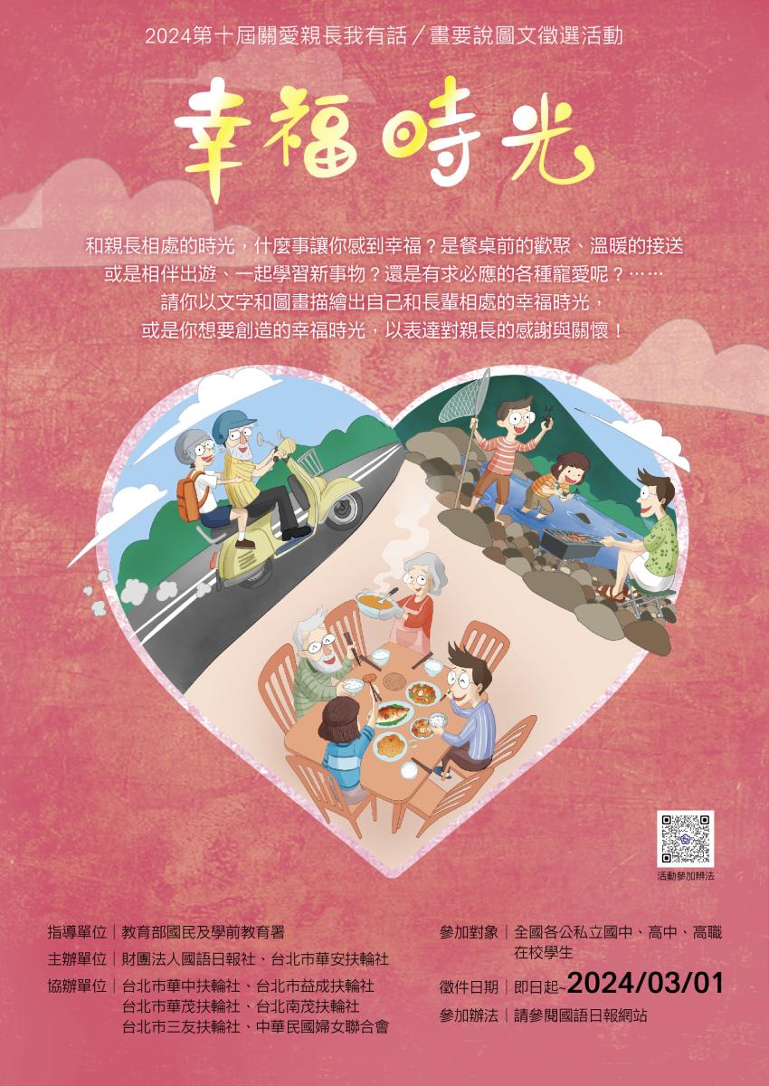 財團法人國語日報社辦理2024第十屆「關愛親長我有話/ 畫要說」圖文徵選,歡迎民眾之適齡青少年(國中 及高中生)踴躍報名參加~ 活動徵件時間自即日起至113年3月1日止, 其他徵稿活動相關資訊及報名資料下載,請見本頁下方-相關檔案處,自行點選下載使用,或是參見國語日報社網站。