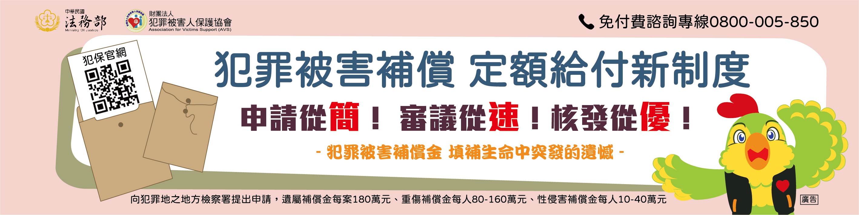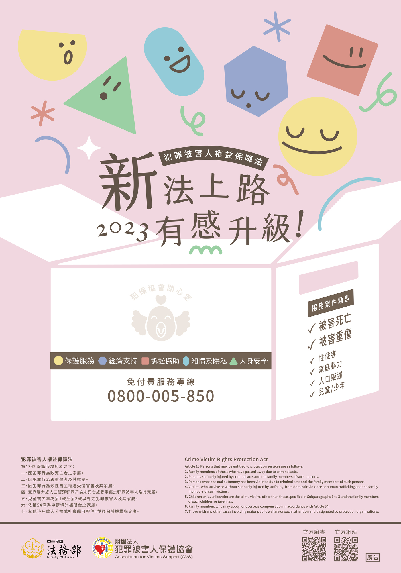 由財團法人犯罪被害人保護協會製作犯罪被害人權益保障法宣導之文宣刊物及影片等素材及電子檔下載連結,歡迎多加利用推廣宣傳~ 有關新法制度介紹請詳參:法務部全球資訊網「 簡介/ 重大政策/ 犯罪被害人保護」 頁面。